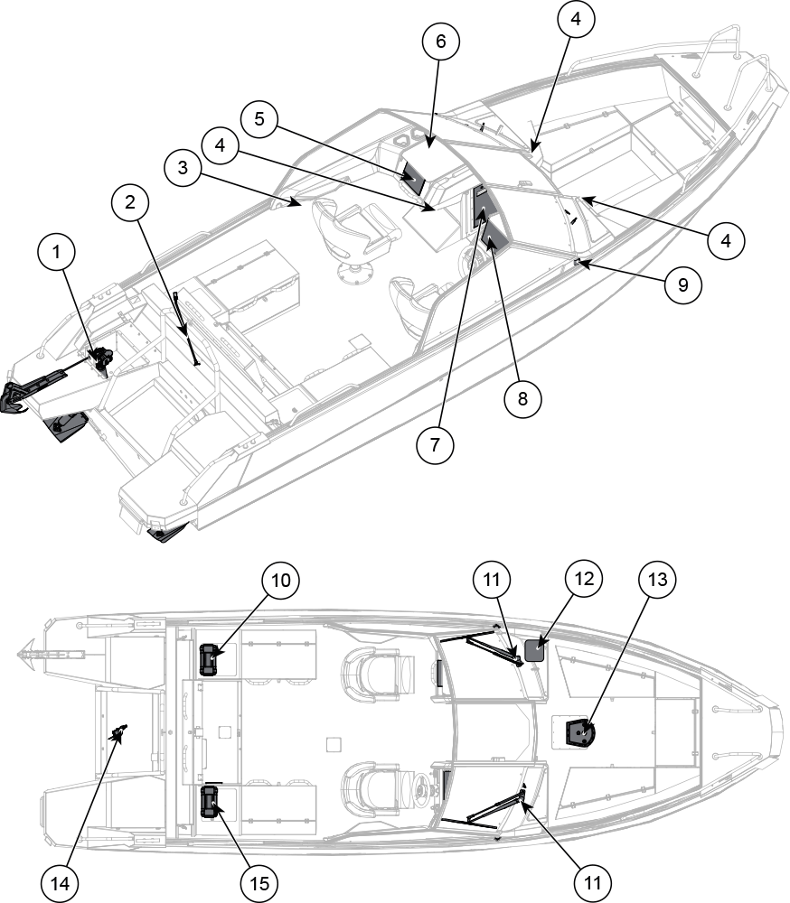 4 | Däckljus | 12 | Kontrollenhet för bogpropellerns effekt * |