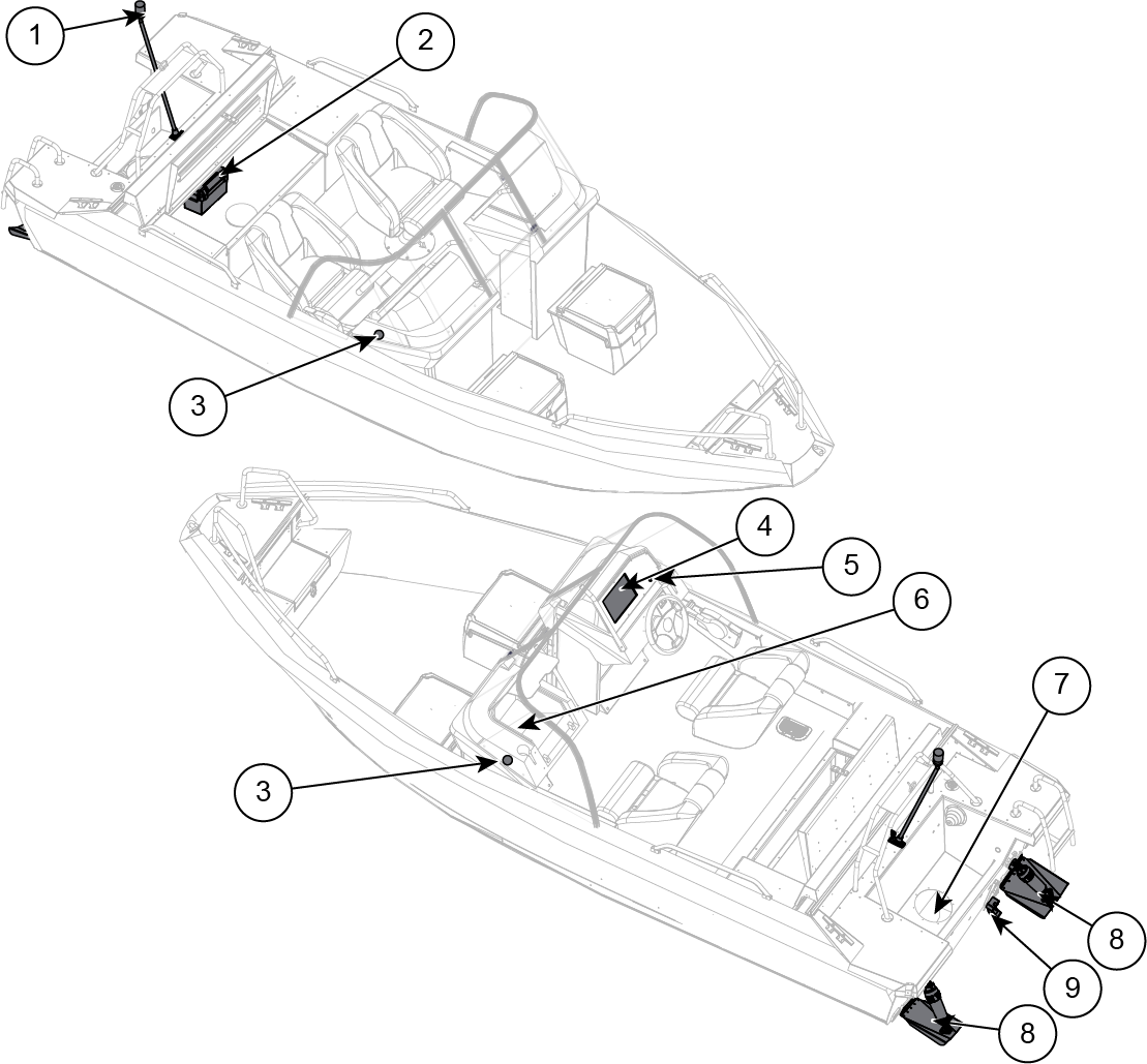 2 | Battery, main switch and fuses | 7 | Bilge pump |